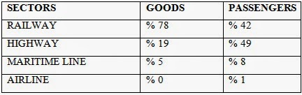 In 2009, railway transport decreased to %1.6 for passengers and to %5.3 for the goods while conveyance by land increased