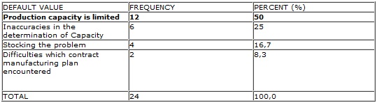 When investigated table 3, most important production problem was seen by 50 % limited capacity, for 25% wrong definition, 16.7 % stocking the problem and %8.3 difficulties which contract manufacturing plan encountered